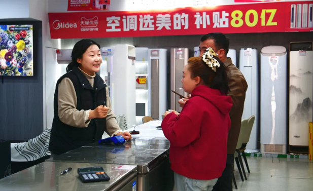 “‘国补’政策实施以来,店内的客流量和成交率都有了明显的增长。今年第一季度成交100余单,销售额超过了80万元,主要为空调、洗衣机、电视等家电,格力、海尔这些国产大品牌深受消费者青睐。”霍尔果斯市天猫优品电器负责人张瑞玲说。