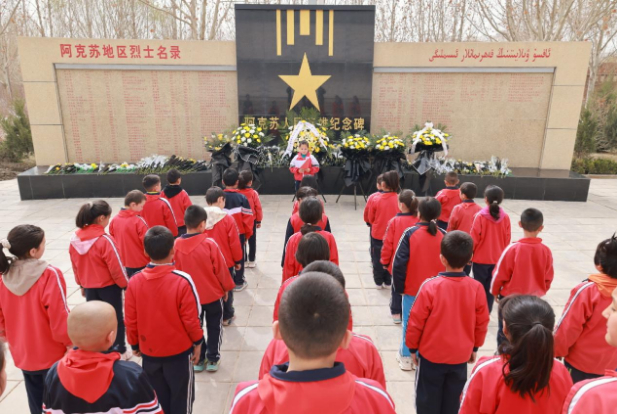 4月2日,温宿县阿热勒镇小学组织百余名师生前往阿克苏人民英雄纪念碑及地区博物馆,开展“清明祭英烈·文脉润童心”主题教育活动。张浩 摄