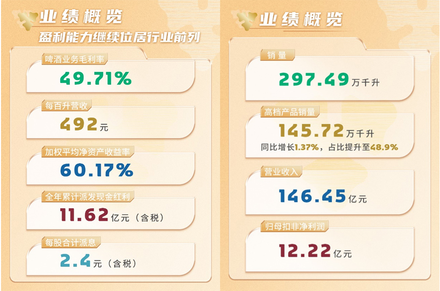 新疆乌苏啤酒有限公司是重庆啤酒股份有限公司的旗下公司。4月2日,重庆啤酒股份有限公司发布2024年年度报告和ESG报告。根据财报显示,公司盈利能力继续位居行业前列。公司全年实现营业收入146.45亿元,归母扣非净利润12.22亿元,营业利润31.85亿元。啤酒业务毛利率达49.71%,每百升营收492元,加权平均净资产收益率达60.17%。 其中,2024年,公司全年啤酒销量达297.49万千升,实现了领先行业的稳健表现。其中,高档产品(8元及以上)销量为145.72万千升,同比增长1.37%,占比提升至48.9%。