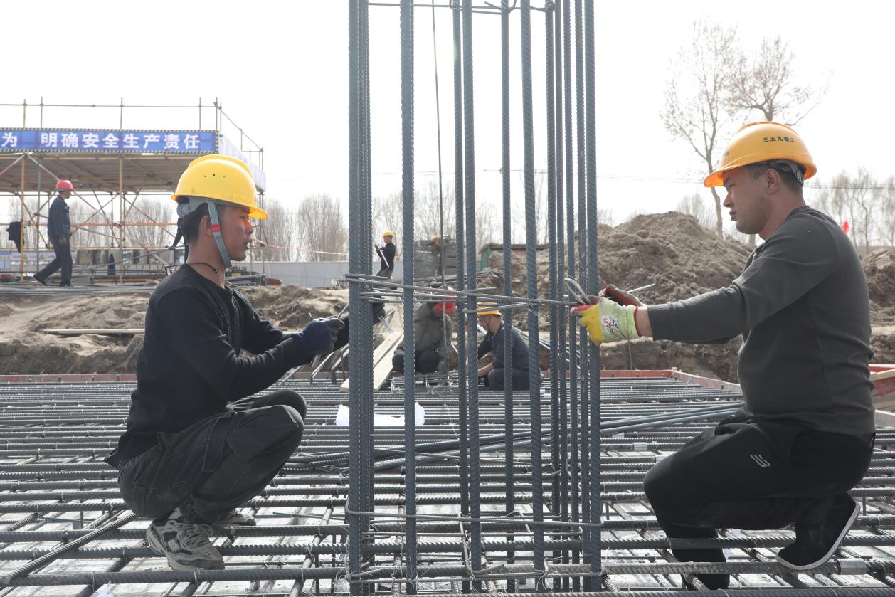 在迎宾大酒店项目建设现场,工人正在捆扎钢筋,搭建框架。田艳玲 摄