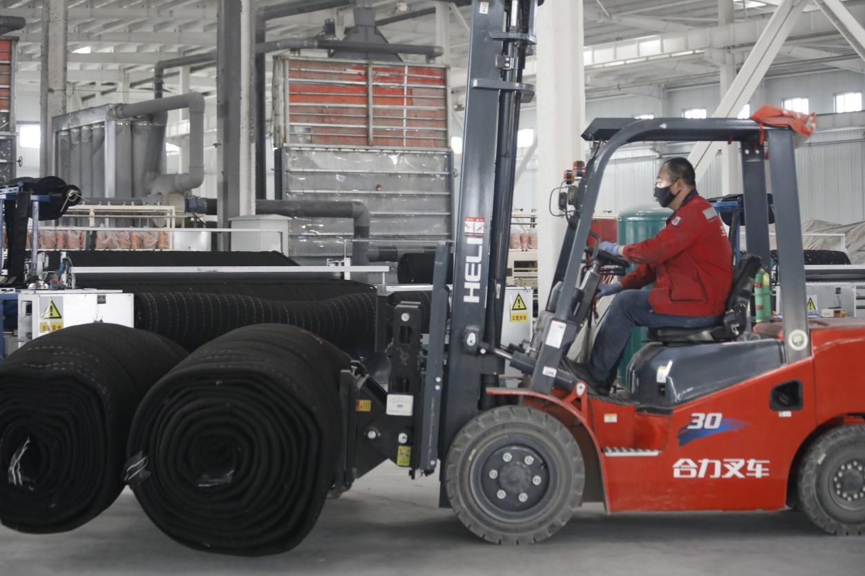 在阿拉尔市驰疆农业科技发展有限公司生产车间,叉车工人正将制作好的大棚棉被运至指定位置。包伟 摄