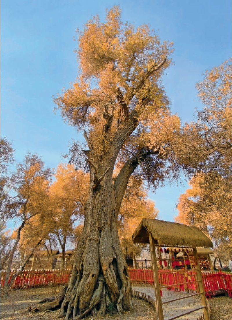三山两盆的雄浑地貌孕育出新疆古树名木的万千气象。它们历经世纪风雨,依旧苍翠擎天,如青铜雕塑刺破苍穹,年轮里深嵌着丝绸之路的生态密码。这些绿色史册不仅记录着西北边疆的生态变迁,更以活态形式守护着三山两盆,成为无可替代的自然遗产、不可复制的“绿色国宝”。