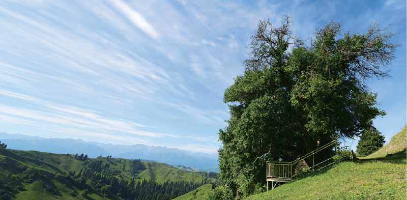 萨哈野果林景区位于伊犁河谷东端,犹如一块镶嵌在新源县阿吾勒山上的明珠。每逢春季,走进这里,层峦起伏的绿野上棵棵果树点缀点点白光,万亩野苹果花竞相绽放,宛若梦境。秋季再来到这里,你会看到乒乓球大小的野苹果压弯枝条,果香弥漫山谷......这里便是亚洲面积最大的野苹果林。在这片果林中,一株屹立在海拔1900多米陡峭山腰上的野苹果树吸引着游人目光。这是一株超过600岁的野苹果树,它用苍翠的身姿展示着生命的坚韧与美丽。这棵新疆珍贵的一级古树不仅是自然界的奇迹,更是镌刻着生态、历史与文化的“活化石”。