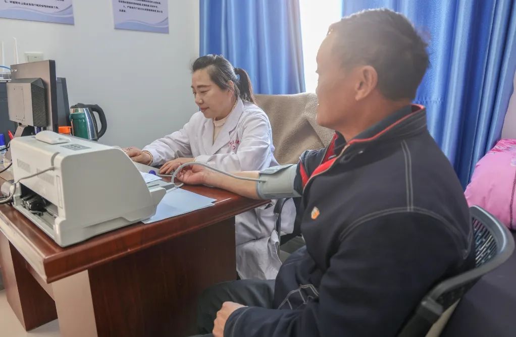 刘卫华在卫生室看完患者后,便背起药箱,穿梭在连队的巷道,深入慢性病患者家中随访。她耐心为患者监测血压、血糖,细致评估健康状况,并反复叮嘱家属用药注意事项。