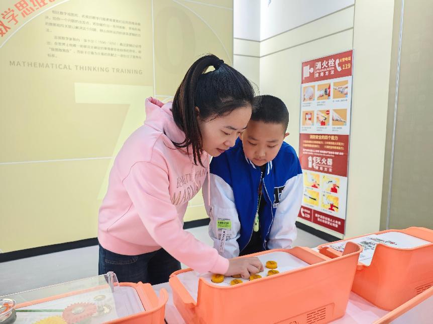 在“科技之基”展厅,小朋友们兴奋地转动着棱镜,眼睛紧紧盯着光的折射现象,脸上满是好奇与惊喜。一旁的“数学思维”训练区域,不时传来小朋友们的欢呼声,他们尽情享受着学习的乐趣。
