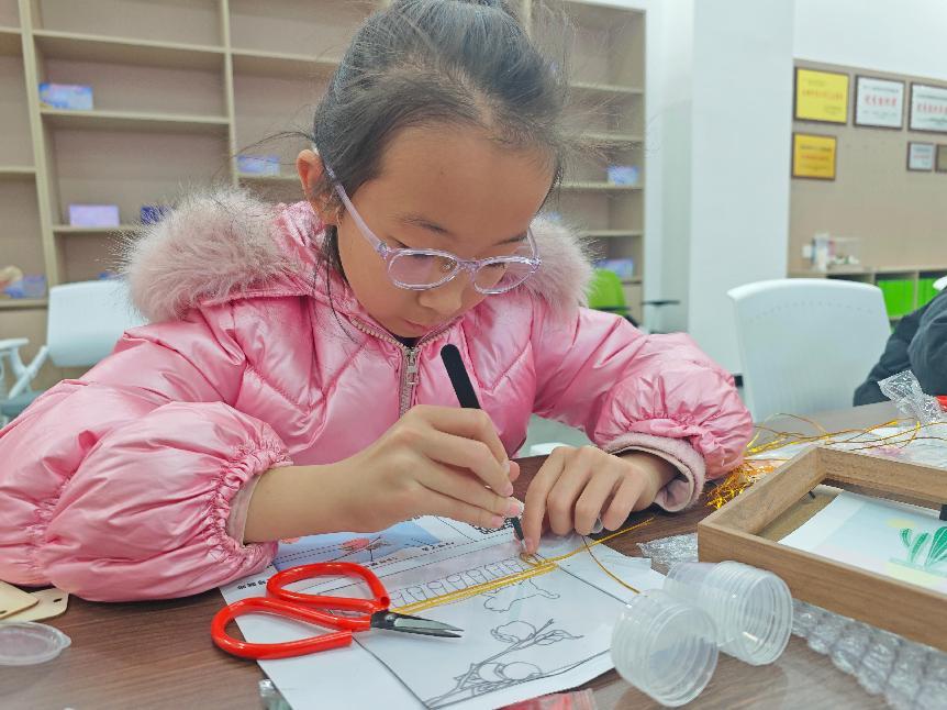 在阿拉尔市科技馆(青少年宫)组织开展的“非遗+科技”体验活动中,小朋友正在制作掐丝珐琅相框。王芳芳 摄