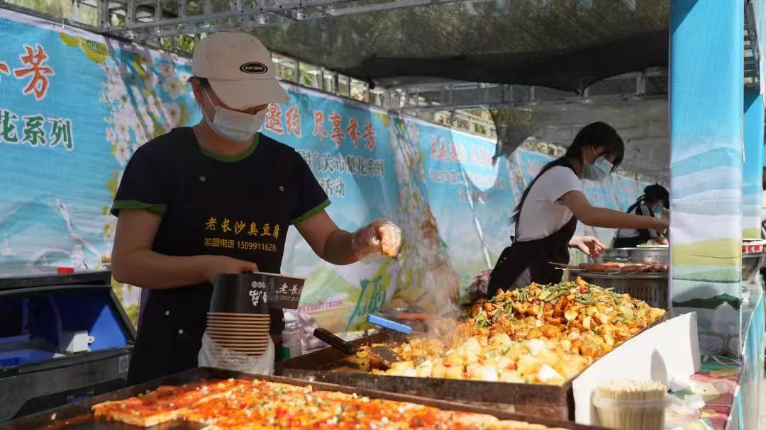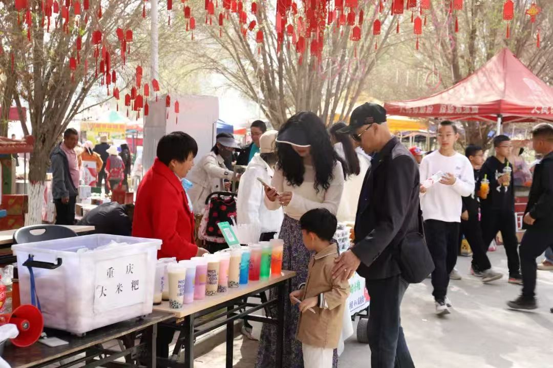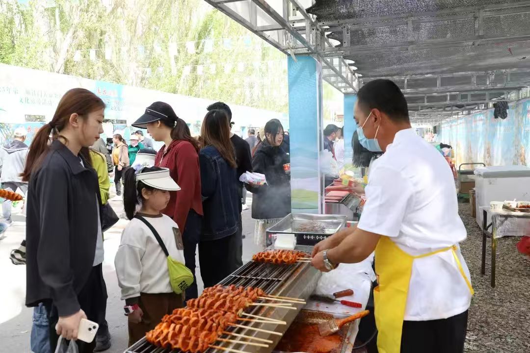 现场还有农特产品、美食小吃等,吸引了大批游客前来品尝选购。三〇团十连“两委”成员陈玲玉说:“今天我们带来了许多鹿产品,很多游客争相购买,生意很不错。”