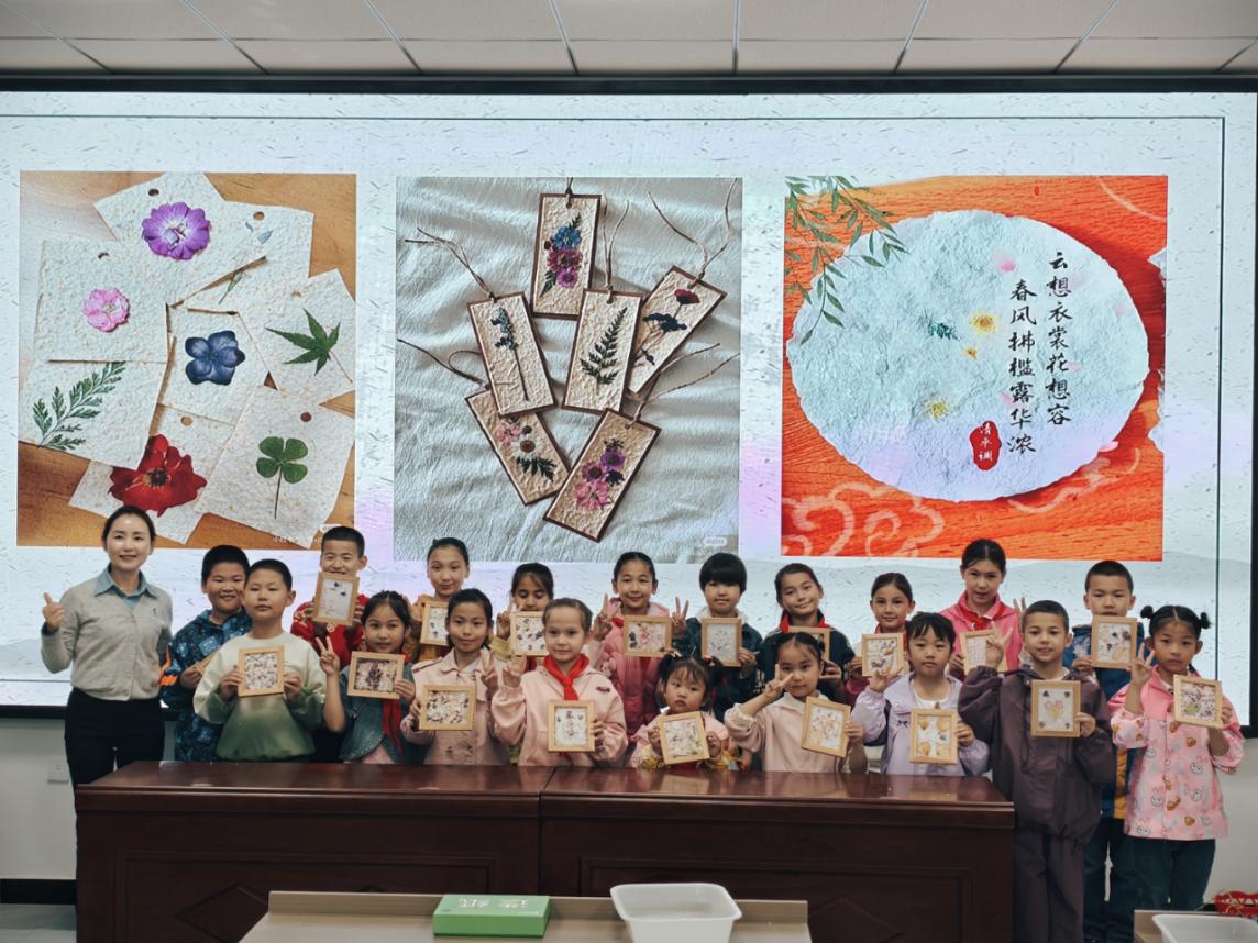 在公益课上,援疆教师章慧洁老师以古法造纸工具为媒介,现场向同学们演示“沉腕稳如磐石,提帘轻若拈花”的技法精髓,带领同学们感受千年工艺的历史厚重。在实践环节中, 学生们在章慧洁老师的指导下,通过捣浆、抄纸等工序,亲历古法造纸十二道核心技艺。 只见同学们手持小木棍轻剔网筛边缘余浆,将薰衣草、铜铃花等新疆特色干花嵌入纸浆。随着纸浆渐干,20张“石榴籽纸”跃然眼前,只见紫穗轻曳的薰衣草与江南古楮纤维相融,在方寸间定格胡杨精神与江南风韵的交响,纸面纹理恰似文化交融的年轮。随着嵌着铜铃花瓣的手工纸在网筛上逐渐成形时,同学们显得十分的开心,不由得分享起动手造纸的感想。