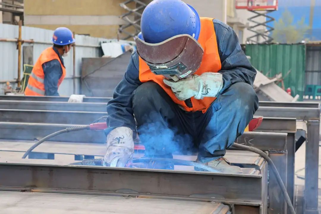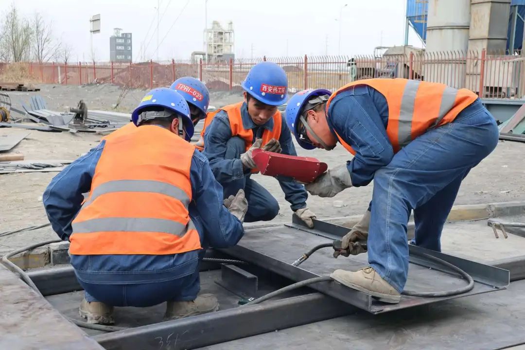 工人正在焊接锅炉烟道。
