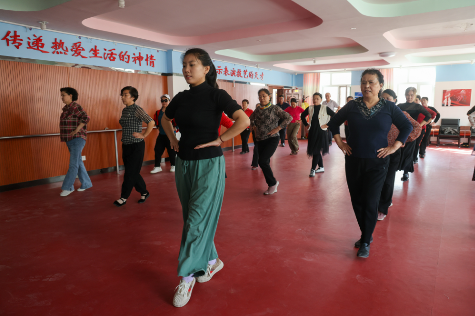 在河北花苑小区的舞蹈室内,舞蹈教师张可盈正在教老年人跳舞,专业的讲解和循序渐进的教学方式受到了居民的热烈欢迎。