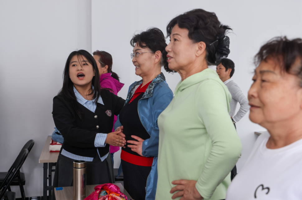 铁门关职业技术学院老师正在向老年人教授声乐知识。