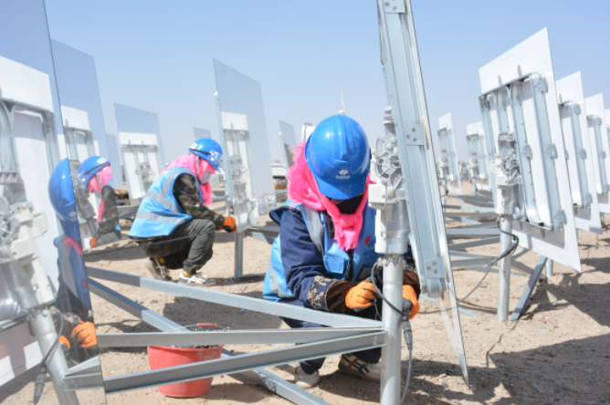 “该项目采用小镜片技术,具有抗风性高、跟踪精度高、光学效率高等特点,支架采用三角形低支架设计,用钢量少,有效节约项目建设成本。”山东电力建设第三工程有限公司若羌光热项目部副经理兼安全总监卞文杰说。