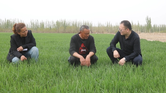 4月13日,走进麦盖提县巴扎结米镇巴扎结米村,映入眼帘的是绿油油的冬小麦随风起伏,一幅生机勃勃的画卷徐徐展开。冬小麦种植户刘术文正与水管员一同仔细查看冬小麦的灌溉情况和生长态势。
