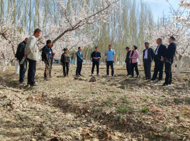 座谈会的余温尚未散去,一行人便迫不及待地迈向田间地头,深入四团十二连的吊干杏园,开启实地参观学习的新篇章。此时,正值吊干杏的开花佳期,满园杏花如雪,芬芳四溢,仿佛在欢迎着这群求知若渴的人们。踏入杏园,技术人员随即围绕当前花期的重点工作——农药授粉,展开了一场生动且实用的现场培训。