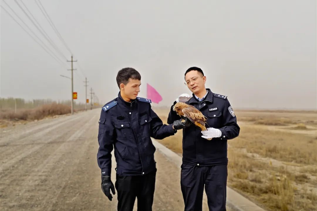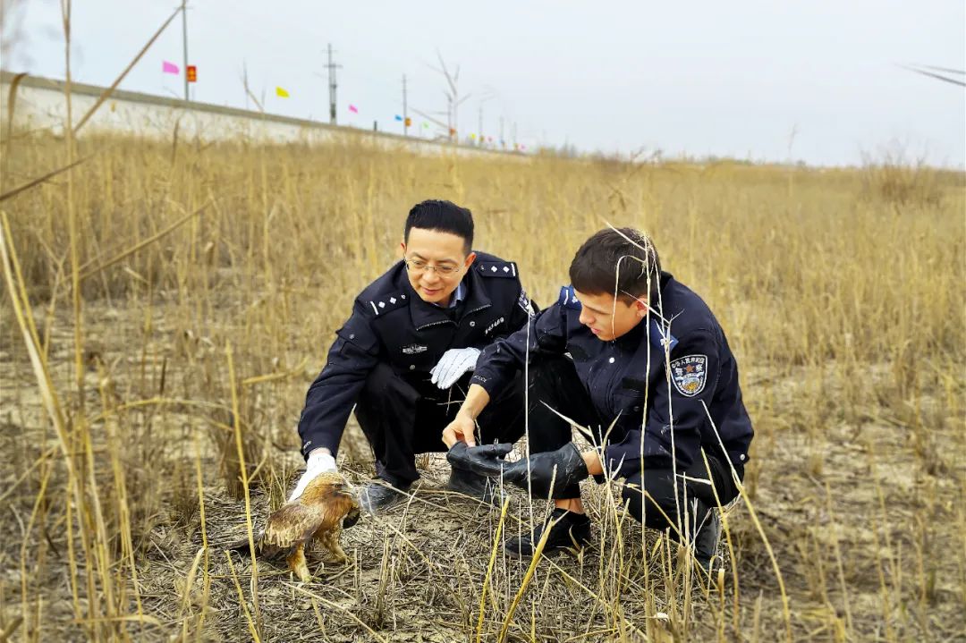近日,新和县尤鲁都斯巴格镇托帕克艾日克村村民克热木·依米尔在农田旁的树林带里,发现一只形似鹰的大鸟蜷缩在草丛中瑟瑟发抖。接受过野生动物保护宣传教育的克热木·依米尔立即拨通了派出所民警的电话,报警称:“自己发现一只大鸟,疑似保护动物,请民警立即开展救援工作”,出警后民警发现被救野生动物系国家一级重点保护动物——金雕,因左侧翅膀受伤后已无飞行能力,无法正常觅食。为确保施救得当,民警当即拨通电话向食品药品环境犯罪侦查大队求助,通过专业救助受伤金雕已被成功放归大自然。