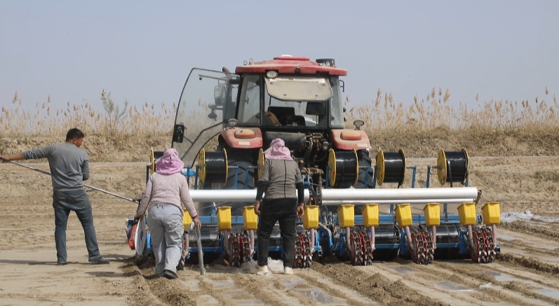 在新疆五征绿色农业开发有限公司广袤的棉花种植基地,3台装备着北斗卫星导航系统的智能播种机正稳健行进,播种、覆膜、铺设滴灌带等工序行云流水、一气呵成。十余名工人紧跟机械作业节奏,不时俯身仔细查看开沟深度、下种间距、地膜覆盖严实度及覆土厚度,并用手中的测量工具校准数据,确保每一处播种细节都达到最优标准。北斗导航的精准定位与人工精细化巡检紧密配合,现代科技与传统农耕智慧在此交织,为棉花丰产丰收筑牢坚实根基。