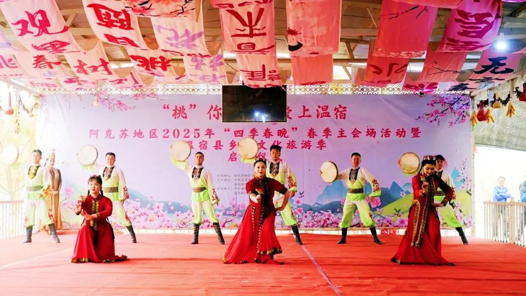 当天上午,阿热勒镇尤喀克麦盖提村,朵朵桃花竞相绽放,如云似霞,与游人、农舍、麦田相映成趣,构成一幅绚丽多彩的春日画卷。活动在开场舞《山水温宿》中拉开帷幕。随后,舞蹈《过河》《美丽的神话》,非遗歌舞《吐曼麦西来甫》等特色节目轮番上演,吸引了来自各地的游客和村民驻足。