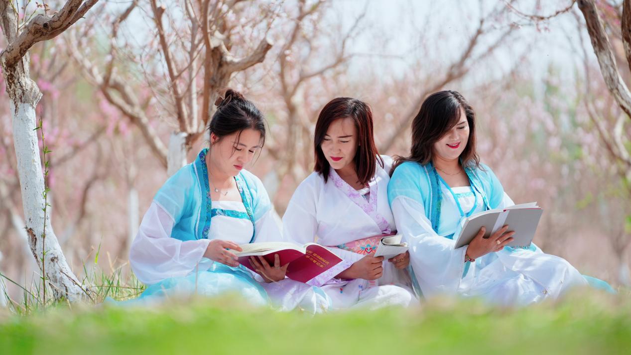 在温宿县阿热勒镇尤喀克麦提村的百亩桃林里,妇女们趁着农闲聚在树荫下读书。(张浩 摄)