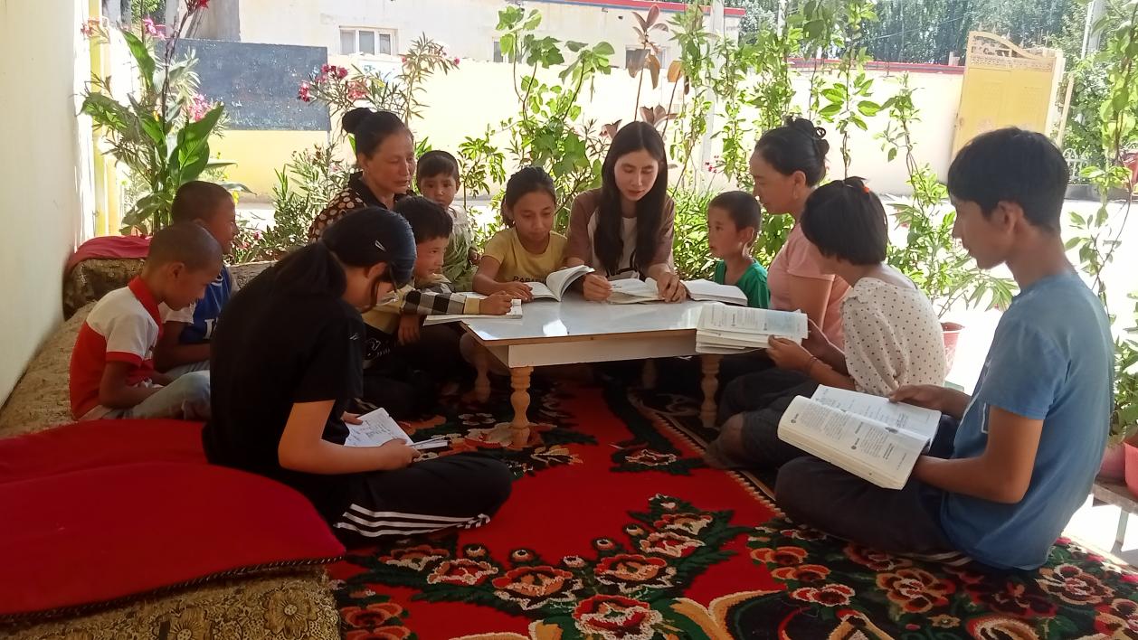 在温宿县阿热勒镇依尔玛村农家书屋,大人小孩们一起享受读书的乐趣。(张浩 摄)