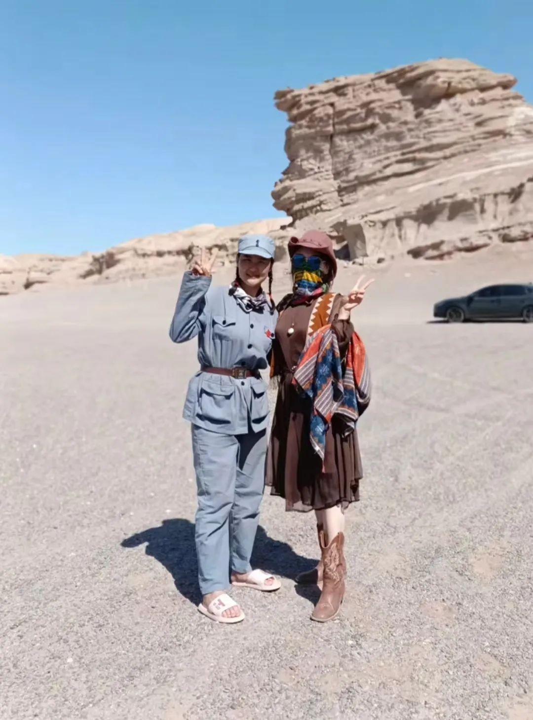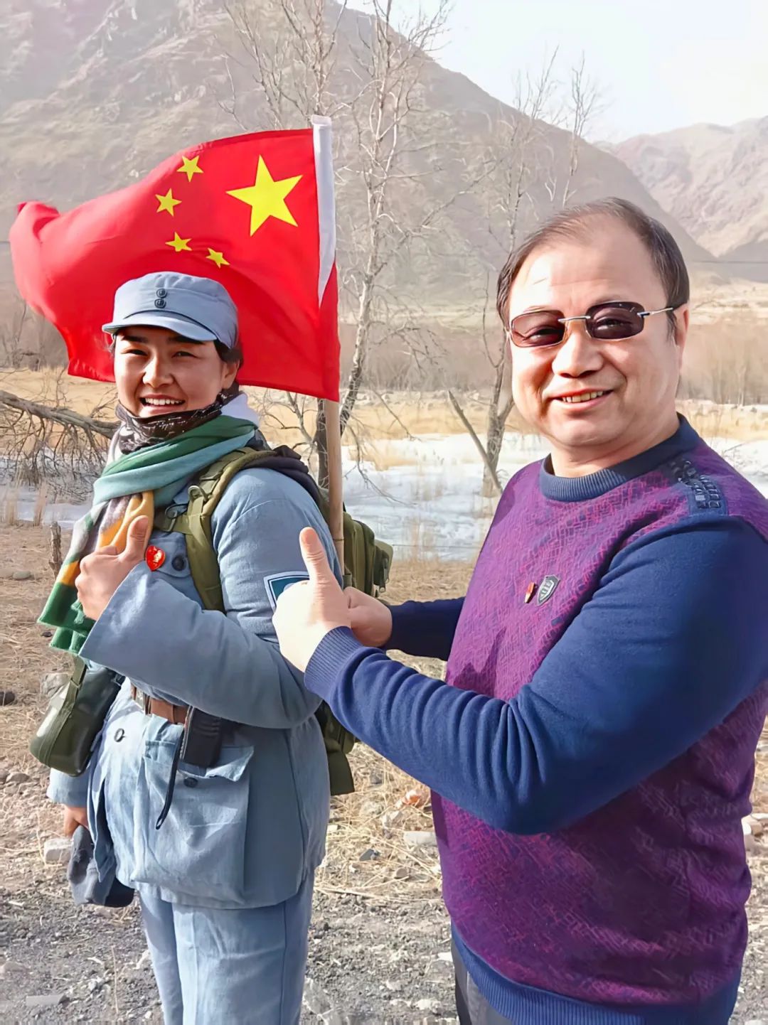 近日,在新疆鄯善县通往哈密市的路上,一位身着灰蓝布军装、扎着双麻花辫、行囊上插着一面五星红旗的少数民族姑娘正阔步向前。