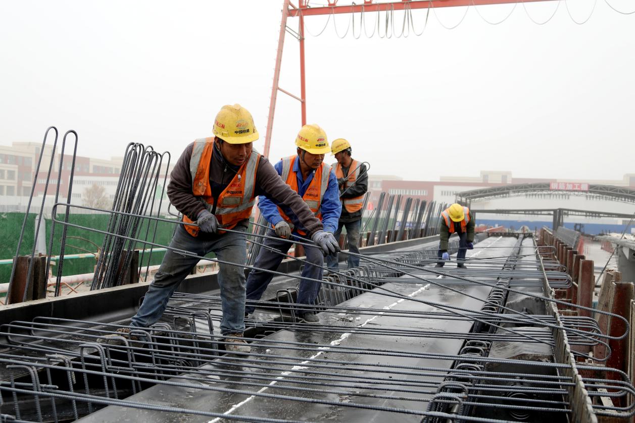 工人在绑扎预制梁顶板钢筋。王芳芳 摄