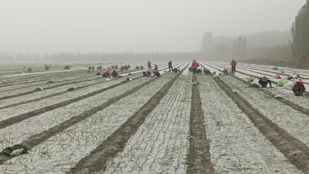 在温宿县恰格拉克乡苏亚克斯村洋葱种植基地,村民们正在给洋葱除草(张铭瑶 摄)