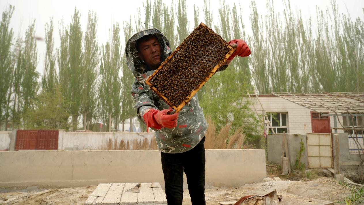 故事始于2020年。艾合买提牵头成立养蜂合作社,以“合作社+农户”模式凝聚村民,共享技术成果的同时,以“授粉+采蜜”生态模式,为果树授粉提升坐果率,实现农业与养殖的双向赋能。这一模式如同强大的引擎,驱动着整个村庄的蜜蜂养殖产业蓬勃发展,让更多村民尝到了“甜蜜事业”的甜头。