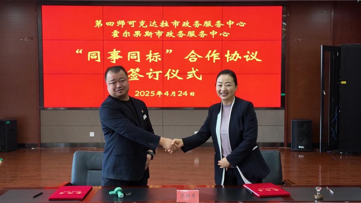 为推进霍尔果斯市与第四师可克达拉市联动制度创新,加快兵地政务服务协同发展,4月24日,霍尔果斯市政务服务中心与第四师可克达拉市政务服务中心举行“同事同标”合作协议签订仪式并召开座谈会。