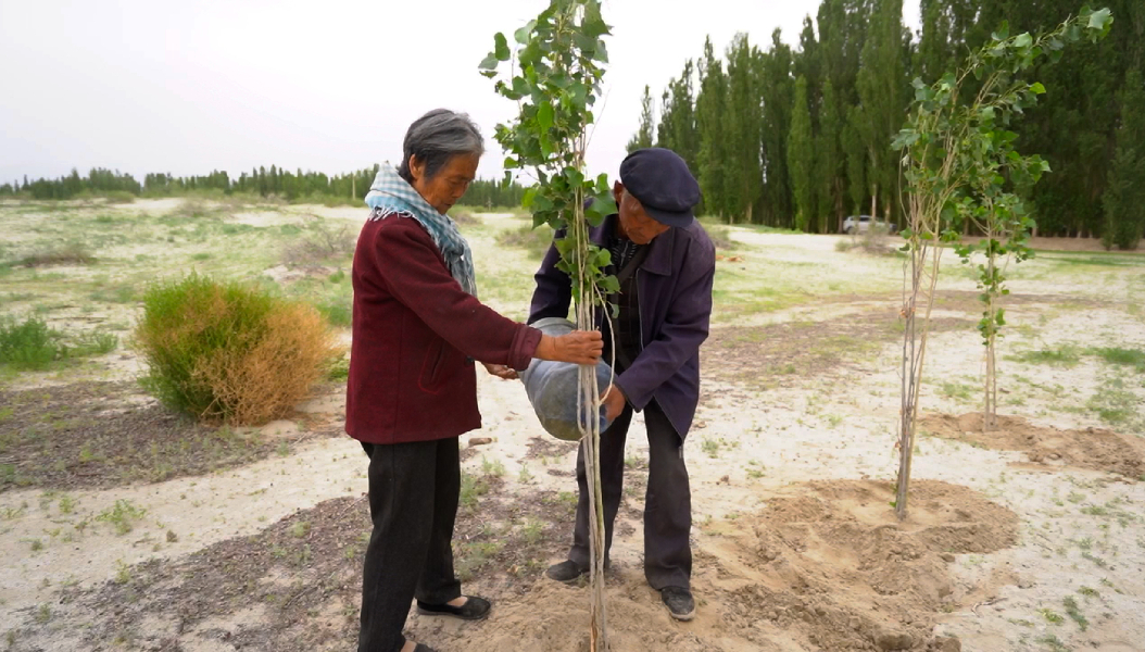 然而,在沙漠种树绝非易事。付志周夫妇从自家麦田边的沙包开始下手,拉沙、平地、挖坑,经济困难,只能捡别人果园里剪下来的树枝插栽。二人天不亮就开始干活,中午就在地里吃干馕,天黑透了才往回走。