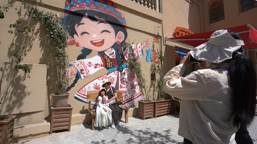 现场,传统手工艺品店陈列着艾德莱斯绸、精美地毯,尽显匠人匠心;民宿以雕花门窗、特色纹饰,带来沉浸式居住体验;咖啡馆内咖啡香与烤馕味交织,民族音乐悠扬;旅拍店的艾德莱斯绸服饰搭配银饰,成游客拍照爆款;特色美食摊前香气四溢,烤包子金黄酥脆,甜香的玫瑰花馕令人垂涎……