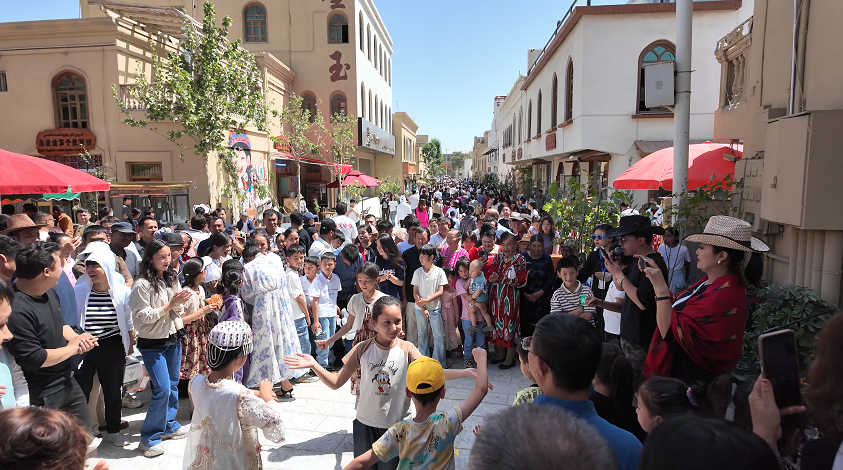 5月1日,墨玉老城锣鼓喧天、彩旗飘扬,身着节日盛装的各族群众与游客齐聚一堂,共同见证老城开城。