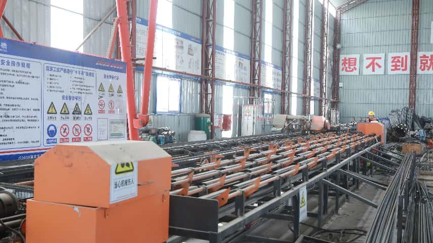 在施工第一合同段综合场站内,一根根螺纹钢筋通过数控锯切套丝生产线,自动完成车丝。该生产线采用国际领先技术,全自动完成钢筋输送、翻料、传递、车丝、打磨工序,大幅度提高了生产效率。