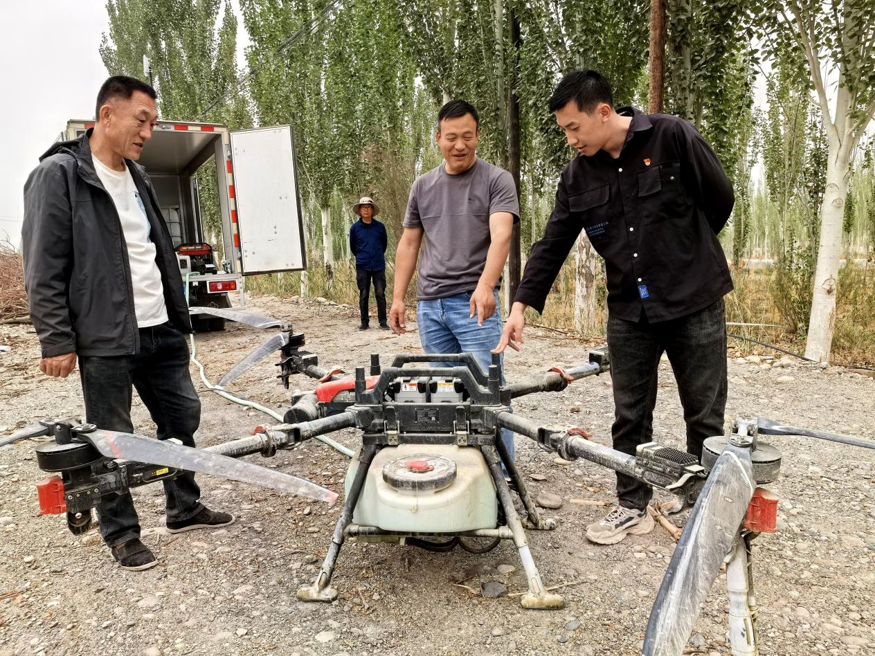 戈壁新村是温宿县重要核桃产区,种植面积达4万多亩。曾因信息闭塞、技术壁垒,难以引入无人机等新型农具。温宿县融媒体中心驻戈壁新村工作队深入调研后,迅速化身“科技红娘”,不仅对接专业无人机服务团队,还组织技术人员实地测绘,量身定制作业方案。驻村工作队长郭海涛表示:“我们发现农户对新技术既渴望又犯难,所以必须打通‘最后一公里’,让科技成果惠及田间地头。”