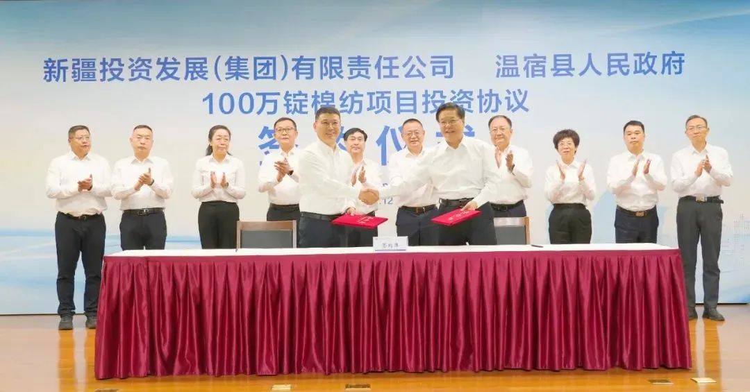 5月12日,新疆投资发展(集团)有限责任公司与温宿县人民政府签署100万锭棉纺项目投资协议。项目达产后,每年可转化优质棉花约17万吨、生产棉纱约15万吨,进一步强化温宿棉纺产业链供应链自主可控能力,为阿克苏棉花和纺织服装产业高质量发展提供坚实保障。