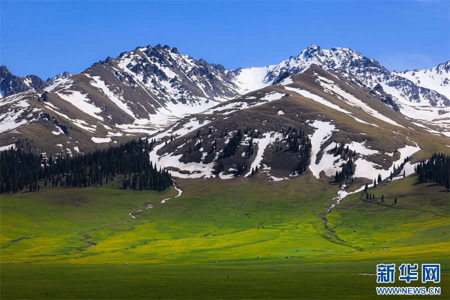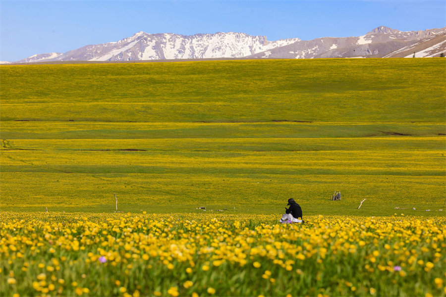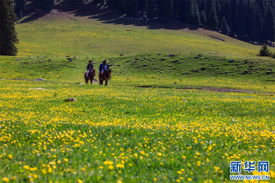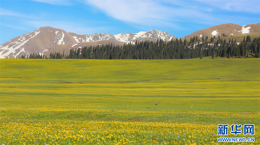 来到那拉提空中草原游牧人家节点,远远望去,金黄色的花朵铺满起伏的草原,与翠绿的草甸,巍峨的雪山,湛蓝的天空,相互映衬,构成了一幅幅色彩斑斓的绝美画卷,让整个“空中草原”华丽变身为“空中花园”。微风拂过,花海泛起层层金色波浪,花香四溢,令人陶醉不已。