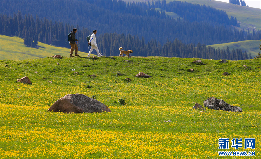 进入5月,那拉提空中草原迎来绝美时刻,大片金莲花绚烂绽放,广袤无垠的草原瞬间化作一片金黄的花海,吸引众多游客前来打卡拍照。