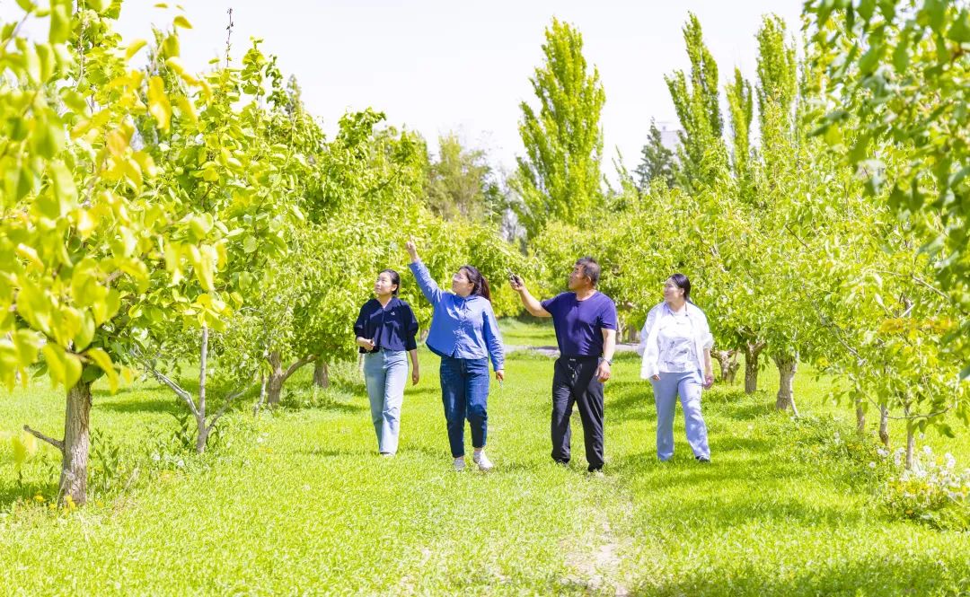 5月6日,在库尔勒市英下乡喀尔巴克村的梨园里,一排排梨树整齐排列,呈现出一派生机勃勃的景象。二师农科所的工作人员和铁门关市佳沐园艺科技开发有限公司工作人员正在给村民玉素甫·买买提讲解香梨管理方法。