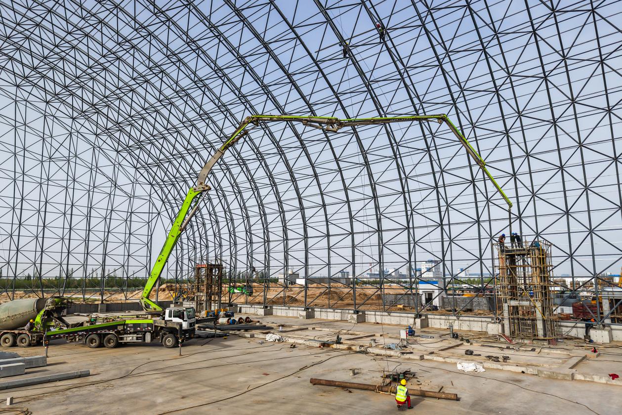 嘉恒热电联产项目干煤棚网架拼装完成,工人正在进行浇筑作业。程永超 摄