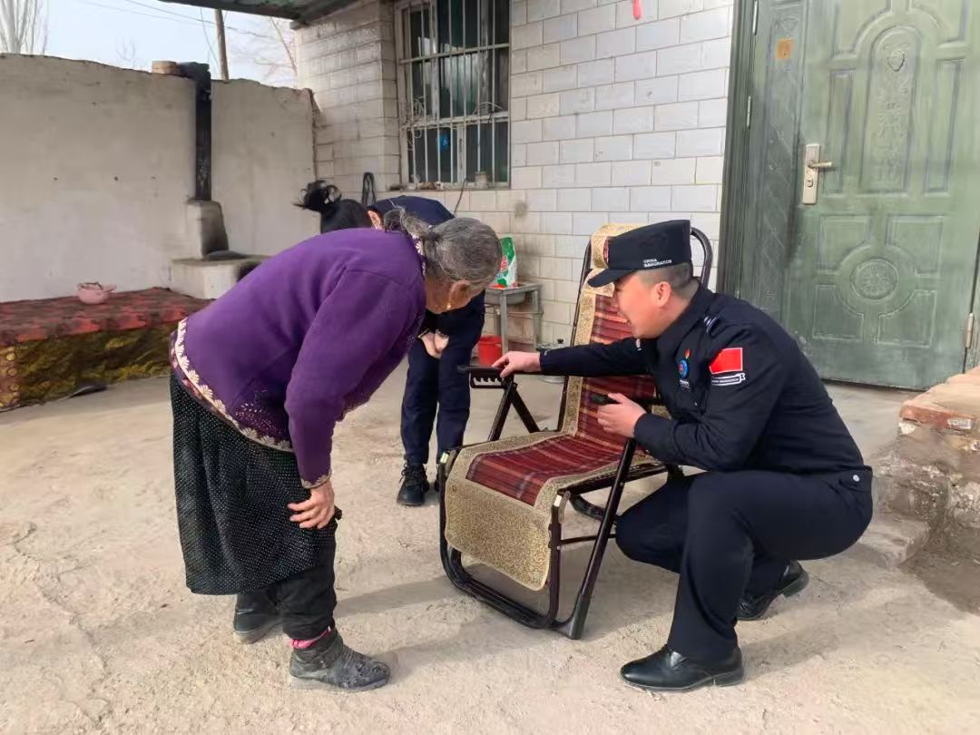 武鹏翔为辖区留守老人送躺椅(侯晔武 摄)