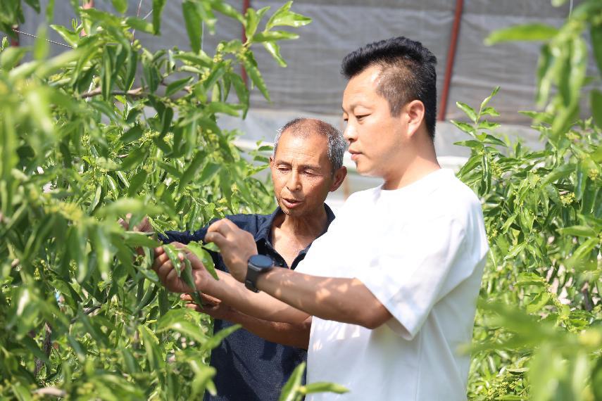 当前正值冬枣坐果关键期,每一个管理细节都关乎着冬枣的产量和品质。魏腾飞仔细查看冬枣的生长情况,从施肥、浇水到病虫害防治,一一为黎京远讲解注意事项。