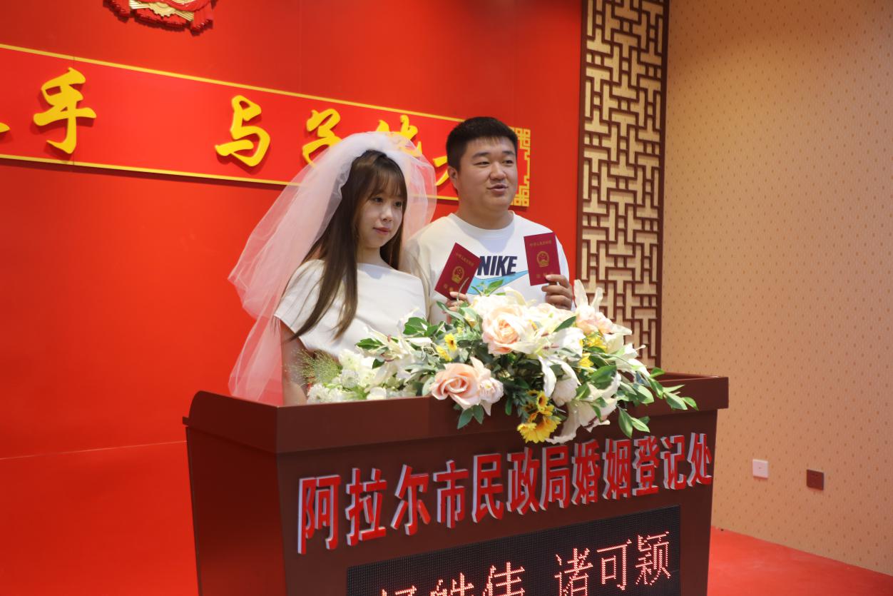 据阿拉尔市婚姻登记处工作人员介绍,当天共办理结婚登记103对,其中,户口在其他省市的新人有12对。