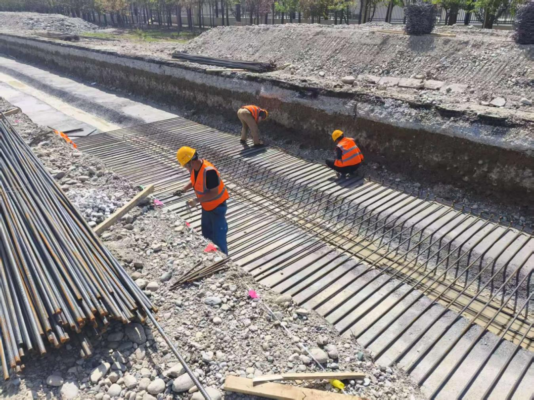 在项目建设一线,几台旋挖钻机24小时不间断运转,钻头深入地底,随着机械臂有节奏地起升,一根根钻孔桩快速成型。预制梁场里,工人们争分夺秒进行场坪硬化和台座施工,为大规模箱梁预制做足准备。道路施工现场,测量人员手持仪器精准定位,工程车辆往来穿梭运送材料,建设者们顶着烈日紧张作业,各道工序高效推进。