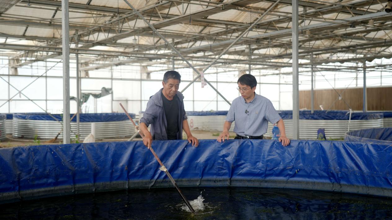 浙江省援疆科技特派员、浙江大学动物科学学院博士董伟仁在新疆金温水产养殖有限责任公司的设施化苗种繁育基地内,查看龙虾苗种繁育情况。(赵新昌 摄)