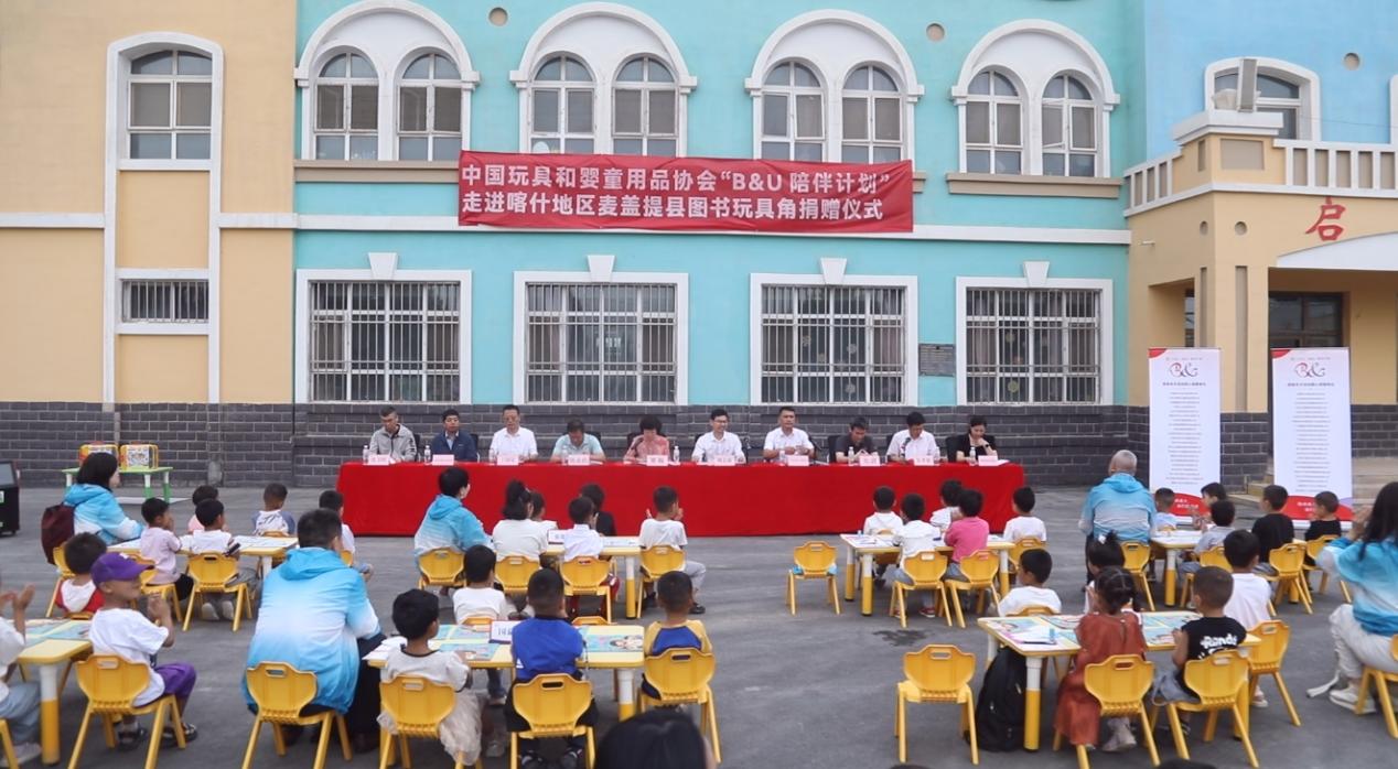 在“六一儿童节”来临之际,5月28日,中国玩具和婴童用品协会(简称中国玩协)主办的“B&U陪伴计划”图书玩具角捐赠活动在麦盖提县央塔克乡中心幼儿园举行。此次共有43家爱心企业参加了捐赠,捐赠物资成本总价值约430万元,为喀什地区孩子们送去关爱与陪伴,点燃乡村振兴的希望之光。中国玩具和婴童用品协会会长梁梅,新疆文物局党组成员副局长周志成,麦盖提县委副书记、县长艾力克木·司拉音参加活动并致辞。