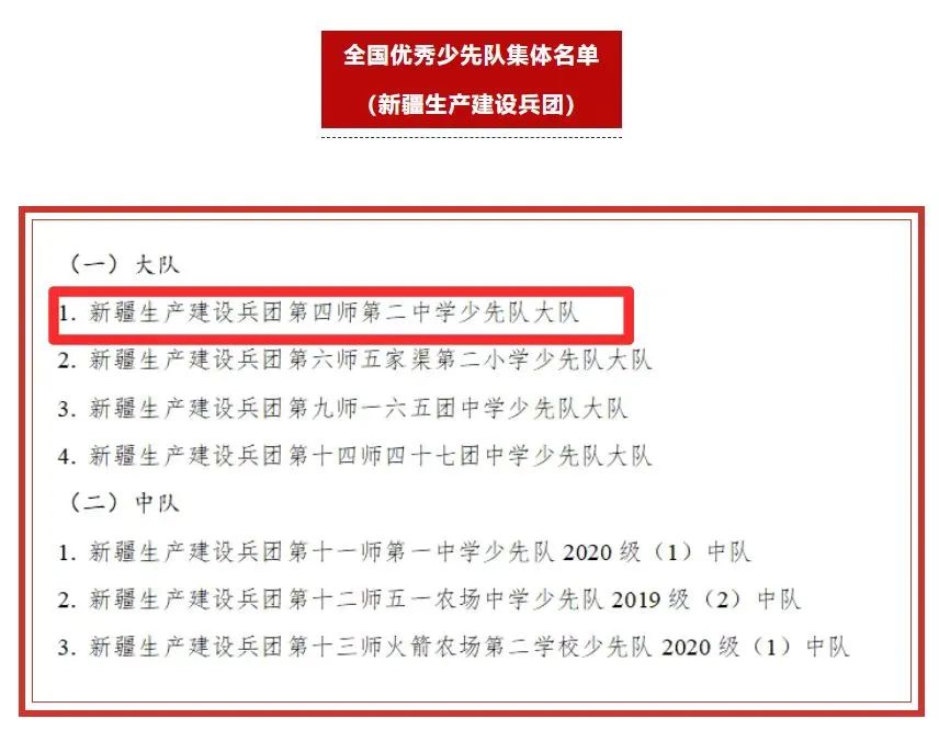 近日,共青团中央、教育部、全国少工委作出表彰决定,授予437人全国优秀少先队辅导员荣誉称号,授予590个集体全国优秀少先队集体荣誉称号,兵团7个集体和4名个人榜上有名。其中,四师第二中学少先队大队脱颖而出,荣获“全国优秀少先队集体”称号这一国家级殊荣。