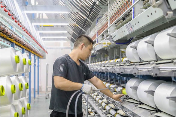 青藤纺织生产车间工人正在操作加弹设备。程永超摄