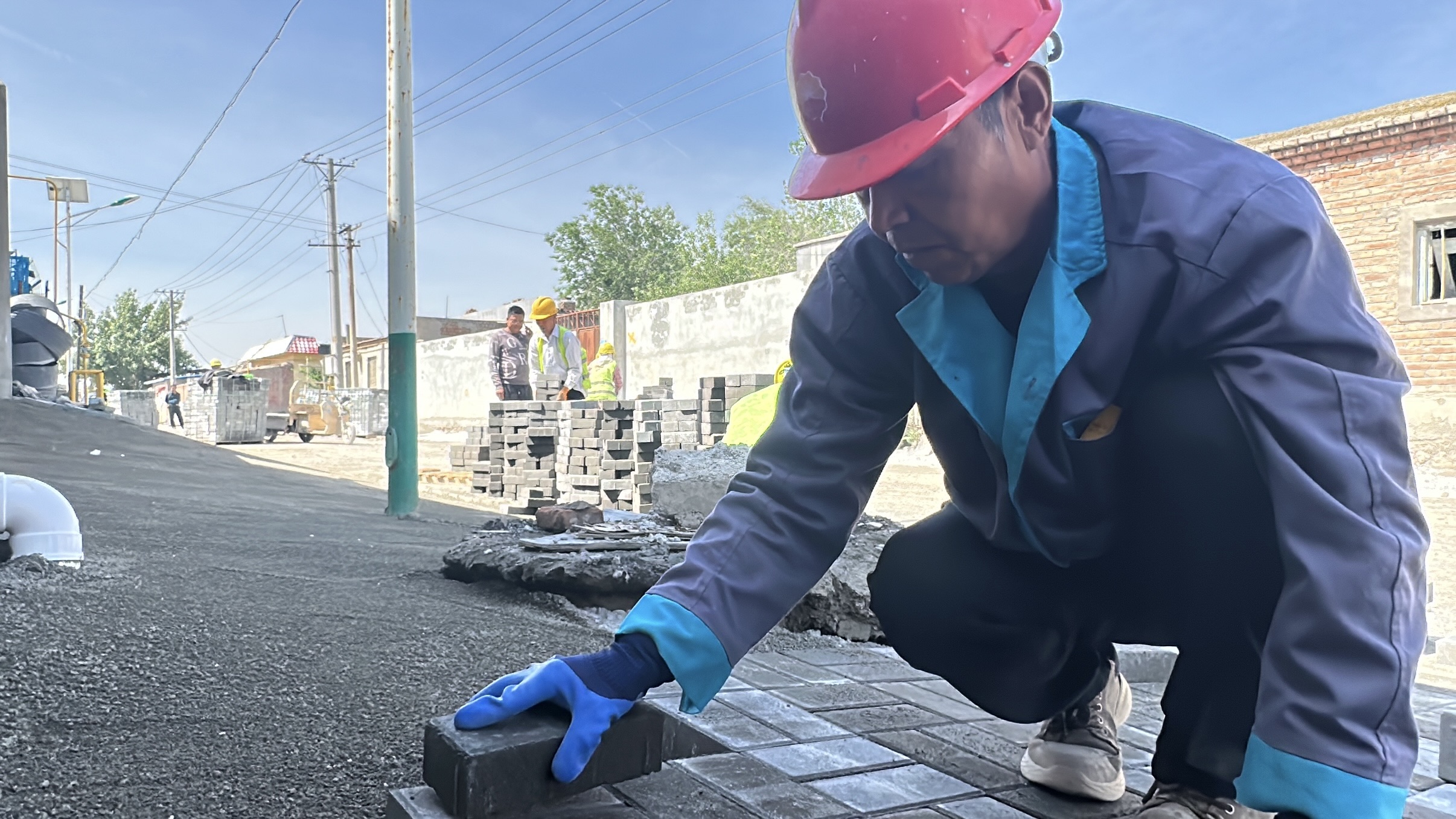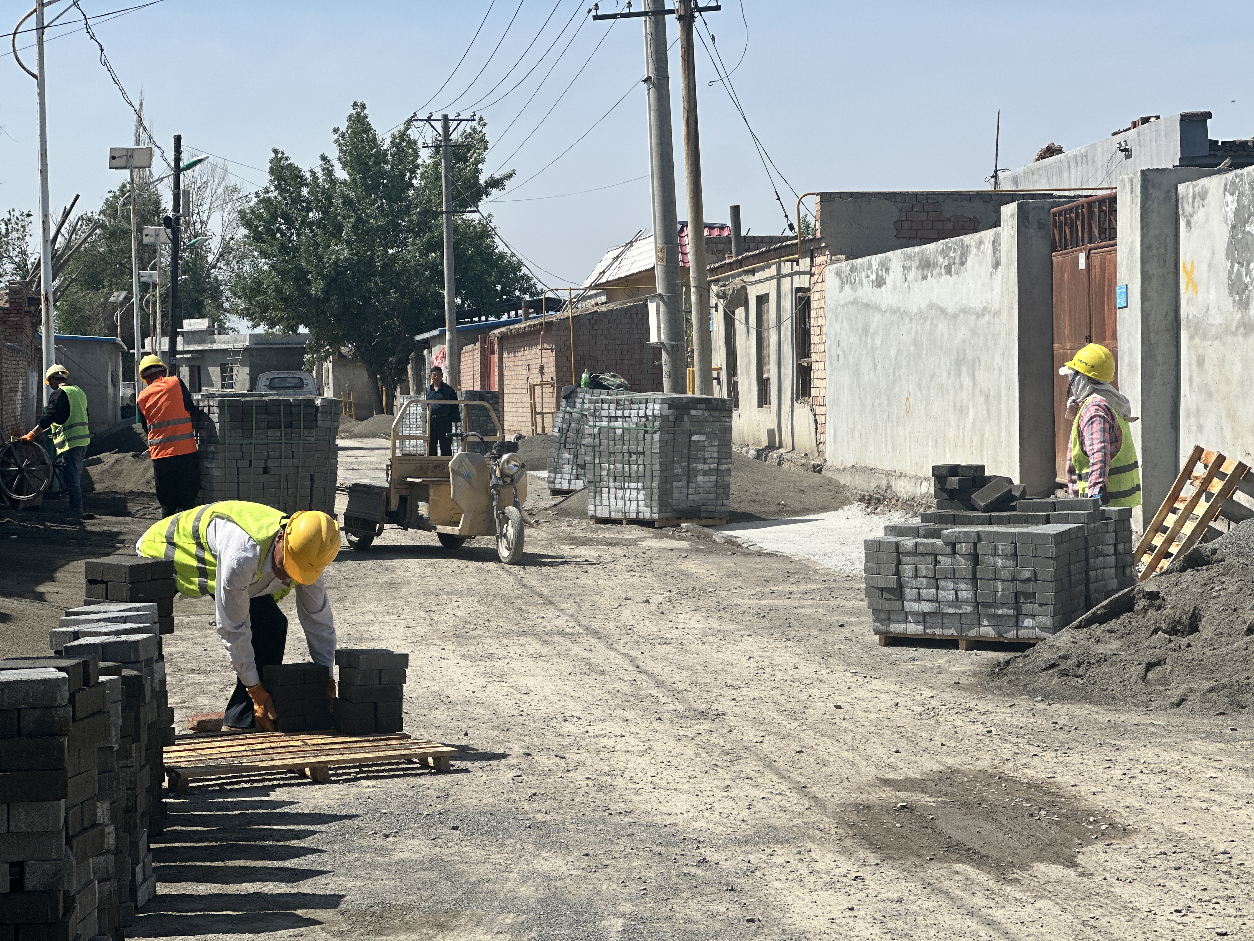 6月3日,记者在米东区长山子镇湖南村的村容村貌提升项目施工现场看到,搅拌机的轰鸣声、铁锹与砂石的碰撞声此起彼伏,工人们正顶着烈日铺设人行道混凝土砖。
