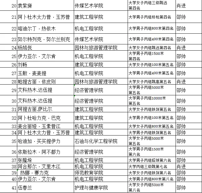 赛前教练组提出了应职速度、应职高度,应职力量的参赛口号,面对比赛备赛充分,运动员信心十足。在比赛中,新疆应用职业技术学院共有五名运动员成绩达国家二级运动员水平。通识学院肖进老师、邵帅老师荣获“优秀教练员”称号,阿亚拉·吐尔逊阿力、甫肉孜亚·麦合莫提同学荣获“优秀运动员”称号。