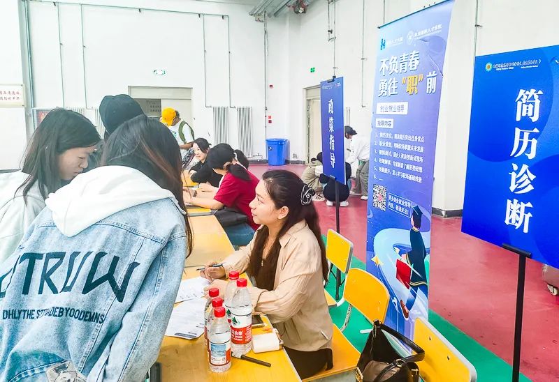 “政策指导”和“简历诊断”咨询台前,工作人员耐心向前来咨询的学生讲解。