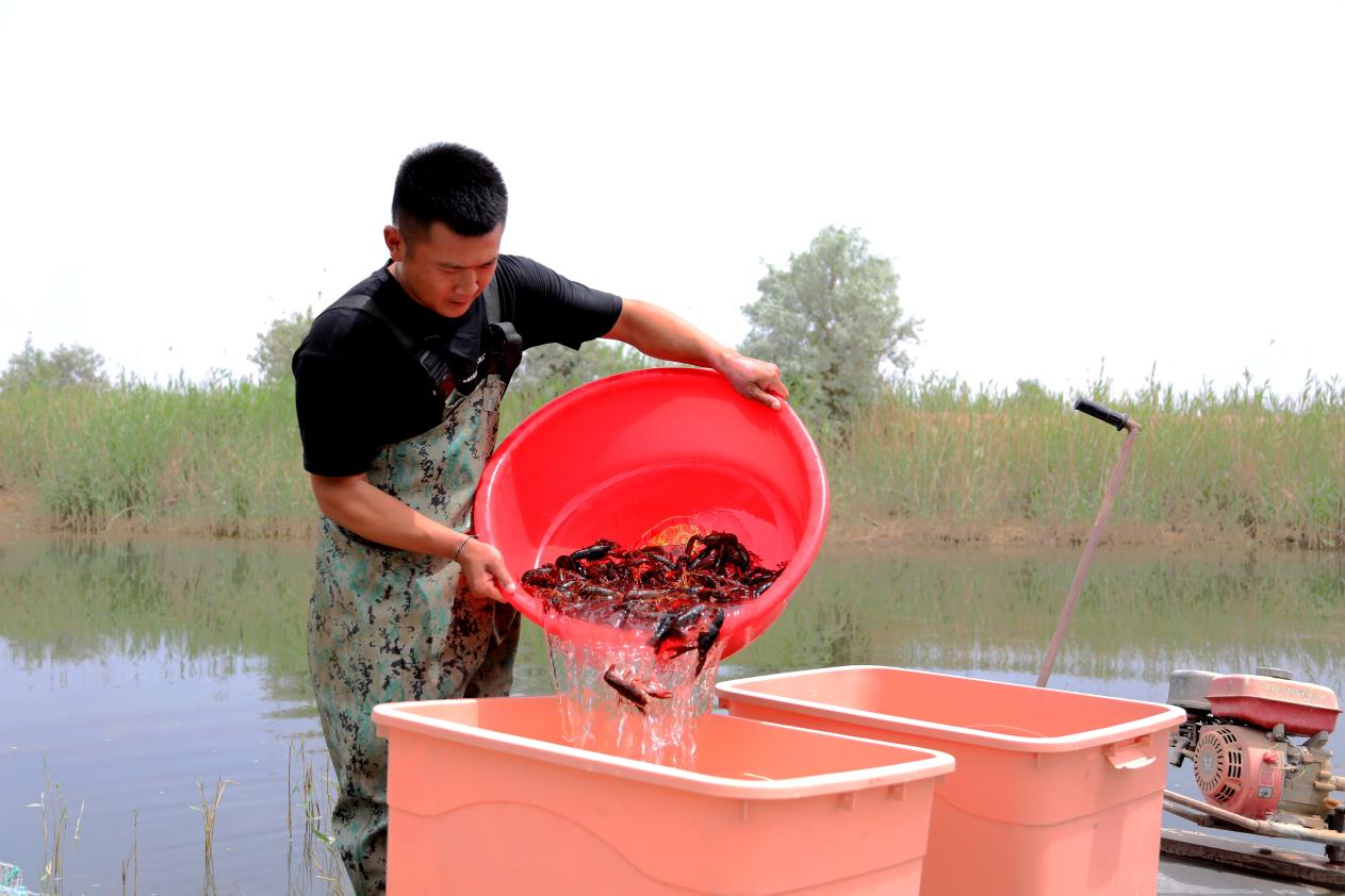 在阿拉尔市古渡口水产养殖农民专业合作社养殖基地,刚捕捞出的小龙虾正在装箱,即将发往订购客商手中。马良栋 摄